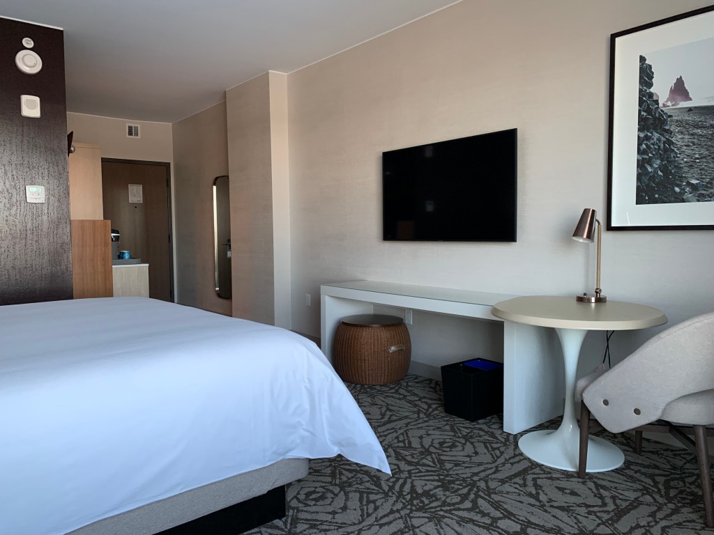 March 2022 Update: A second stay. Still no TSA access to the airport, but we did get a tip from a hotel staffer on walking from the hotel to the newly built parking garage where there’s tram access to the airport. A chilly walk at 7 am in March but better than the shuttle!