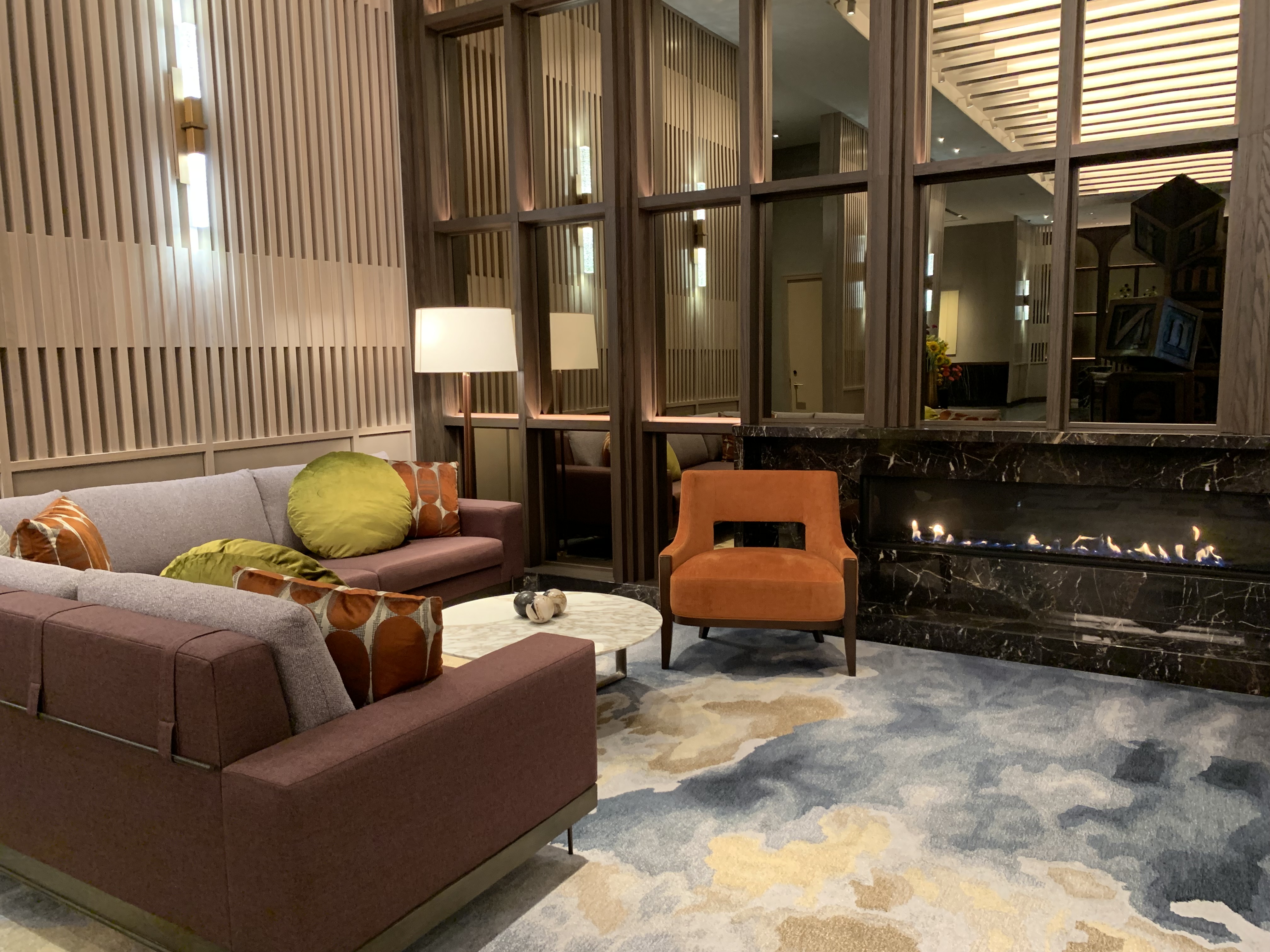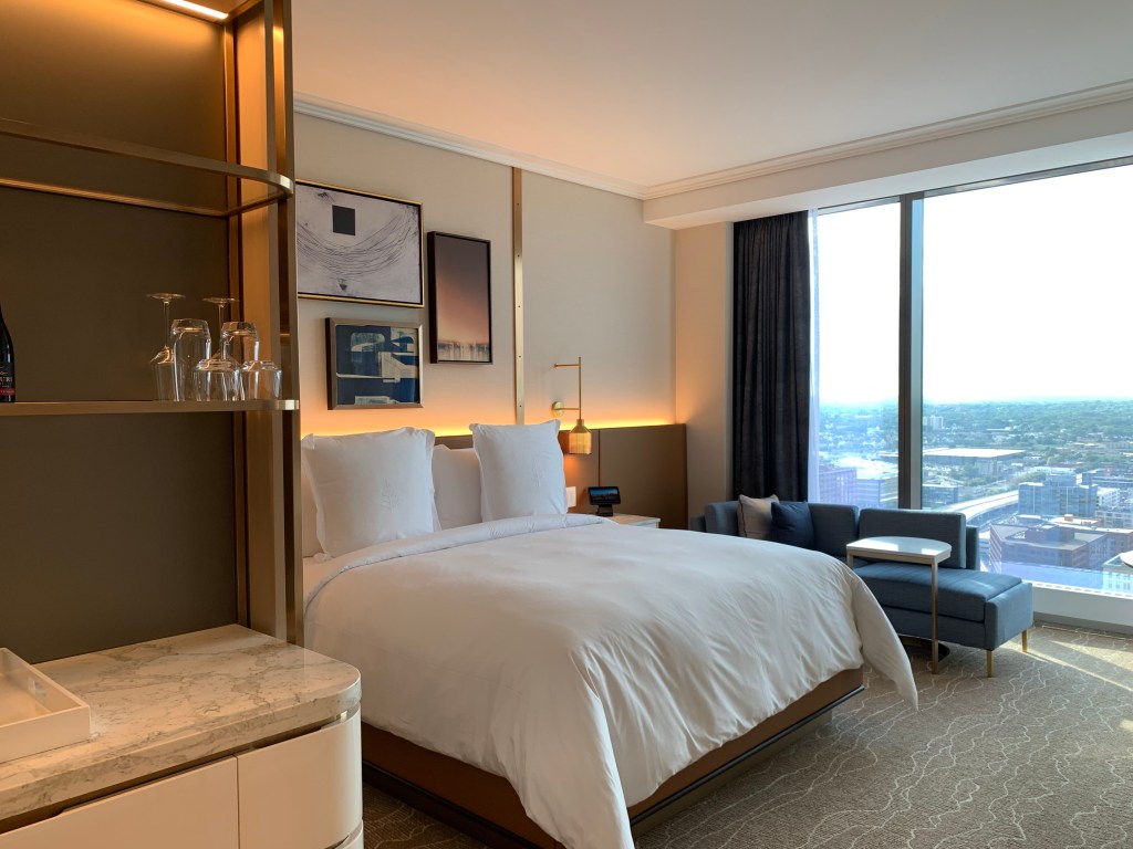 The hotel occupies 8 floors in the middle of the tower with offices below and residences above. Our room on the 24th floor delivered views of the Mississippi River and the metropolis from downtown toward the northwest suburbs. We had fun looking out the floor-to-ceiling windows and identifying landmarks we had spent time in on the ground; in fact, from the hotel, many of Minneapolis’s iconic buildings are visible. The room was thoughtfully conceived and well-executed with design-grade furnishings throughout. Everything just worked: The drapes opened upon entering. The integrated technology was advanced but intuitive. The storage allowed us to unpack our admittedly small bags and store them away (although we had a small quibble that the luggage rack couldn’t be stored in the closet without getting in the way of hanging clothes). The coffee/tea bar was well-stocked. And the bathroom was luxurious with an oversized shower and separate toilet closet. The room did, however, still feel like a room in a corporate property, which isn’t necessarily a detractor but worth noting.