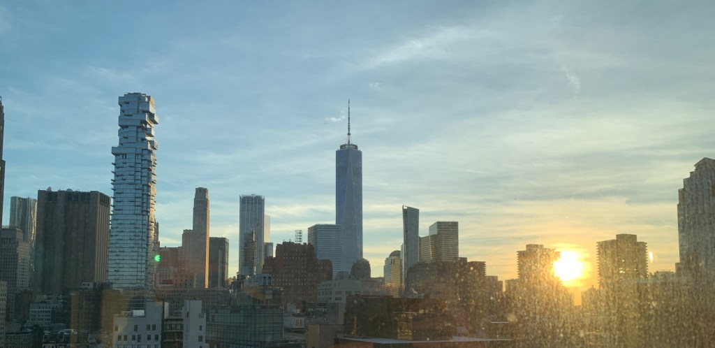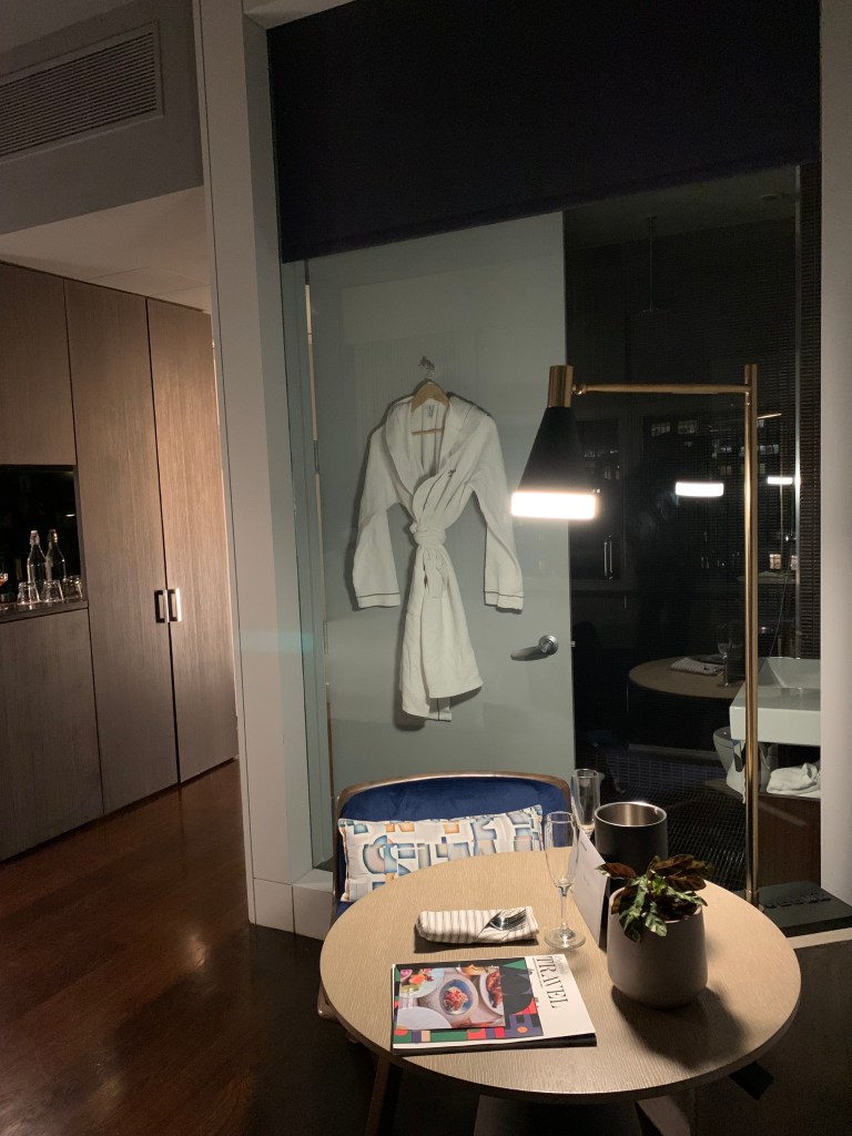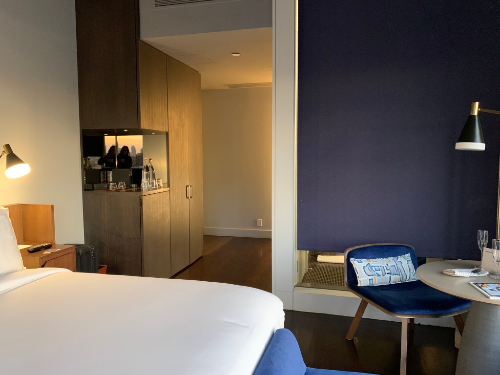 We arrived in our room to a bottle of chilled Cava, a cream puff (which was delicious even two days later when we finally got around to eating it), and a welcome note from the guest services manager. (As an aside, we’ll say that the staff was attentive and helpful and got us an on-the-spot booking at a restaurant where we could satisfy our paella craving.) When we managed to pull ourselves away from the view, we found a room that was well-designed and functional, and it offered more breathing room than many NYC hotels. The wrap-around windows, the high-ceilings and glass wall into the bathroom (with a mechanical blind) made the room airy and light-filled. We also appreciated that we could open the windows each night to allow in the fresh air; that — in combination with the Beautyrest “Black” mattress and Frette linens — made for a very good night’s sleep.