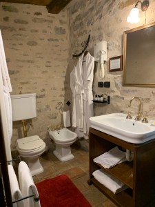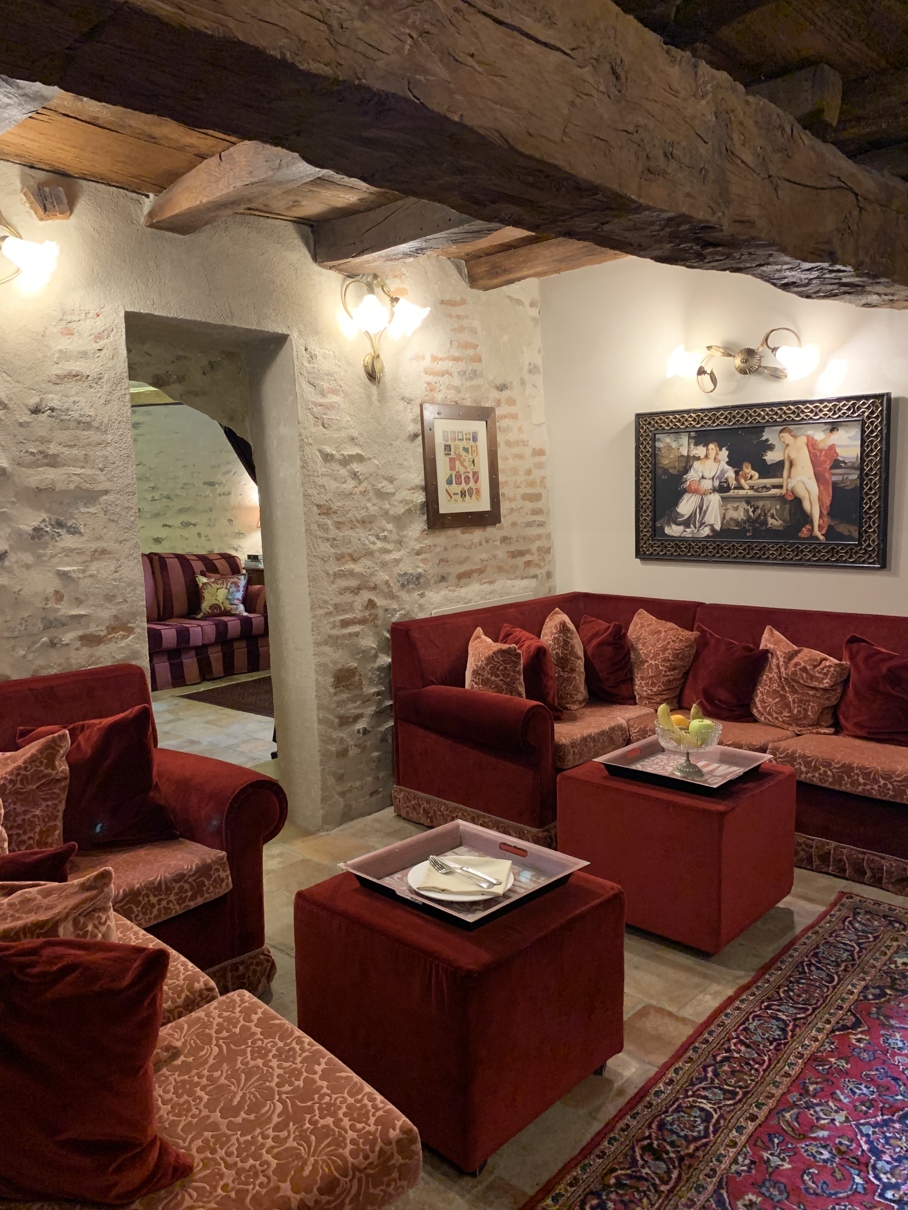 We’ve stayed in many unique places, but even by our standards, the room was a standout. Sleeping in the former chapel of the castello, complete with a stone arched ceiling in the bedroom, was — pun intended — heavenly. The castello’s history permeated our quarters, from our giant door key to the meter-thick walls. We had a spacious bedroom (the chapel), a sitting room with two sofas, and a bathroom, all of which had windows that opened to the autumn Piemontese breeze. The decor was a little over-the-top for our taste, but it felt true to the property, and the theme played out throughout the hotel. It was clear that all of the choices were intentional and showcased the owner’s design sense. One of our favorite touches was the turn-down service with a unique quote for each day.