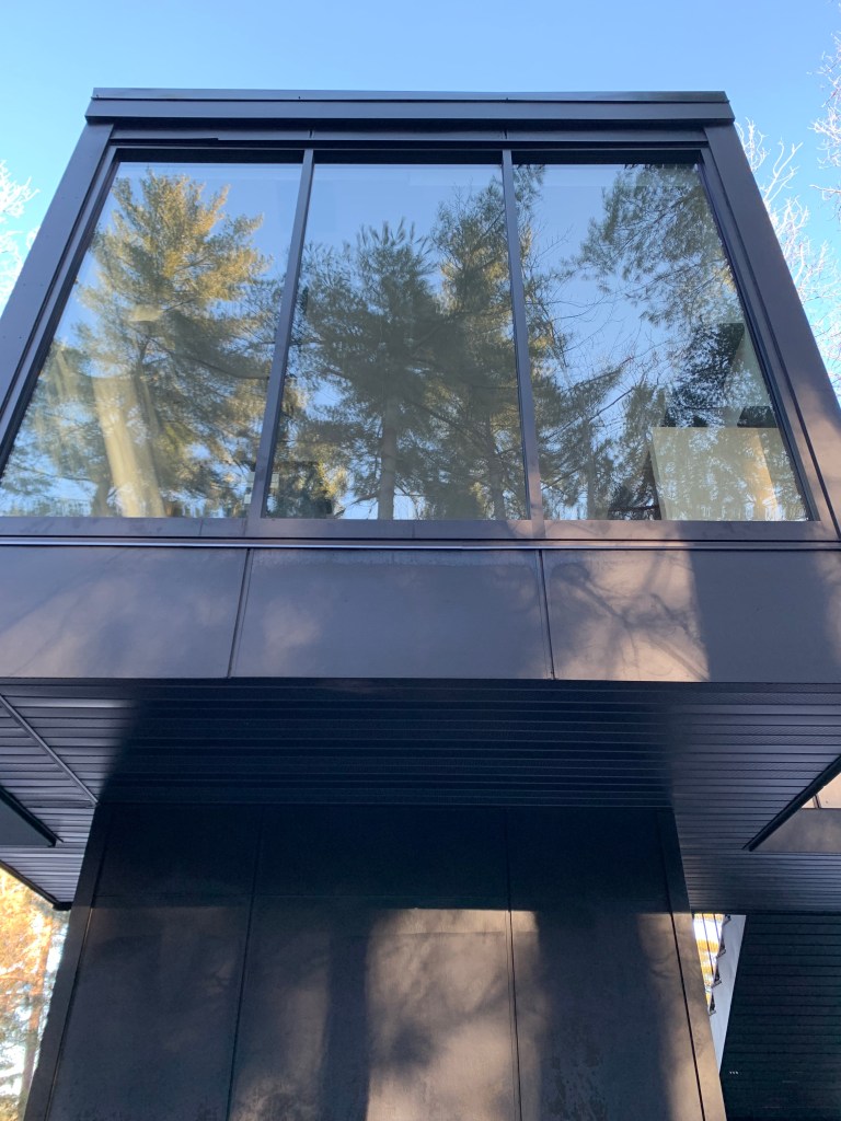 When we made our booking, we had a choice between a cabin looking out on Clark Lake or an elevated cabin facing into the forest. The treehouse experience sounded intriguing, so we chose that one, not knowing exactly what to expect. Upon arrival, we were directed to Cedar Cabin #11 – a stand-alone structure and one of two with this particular design – jutting up from ground level with access via an external staircase. Inside, a massive picture window looked out to the woods; it really did feel like a luxurious treehouse.