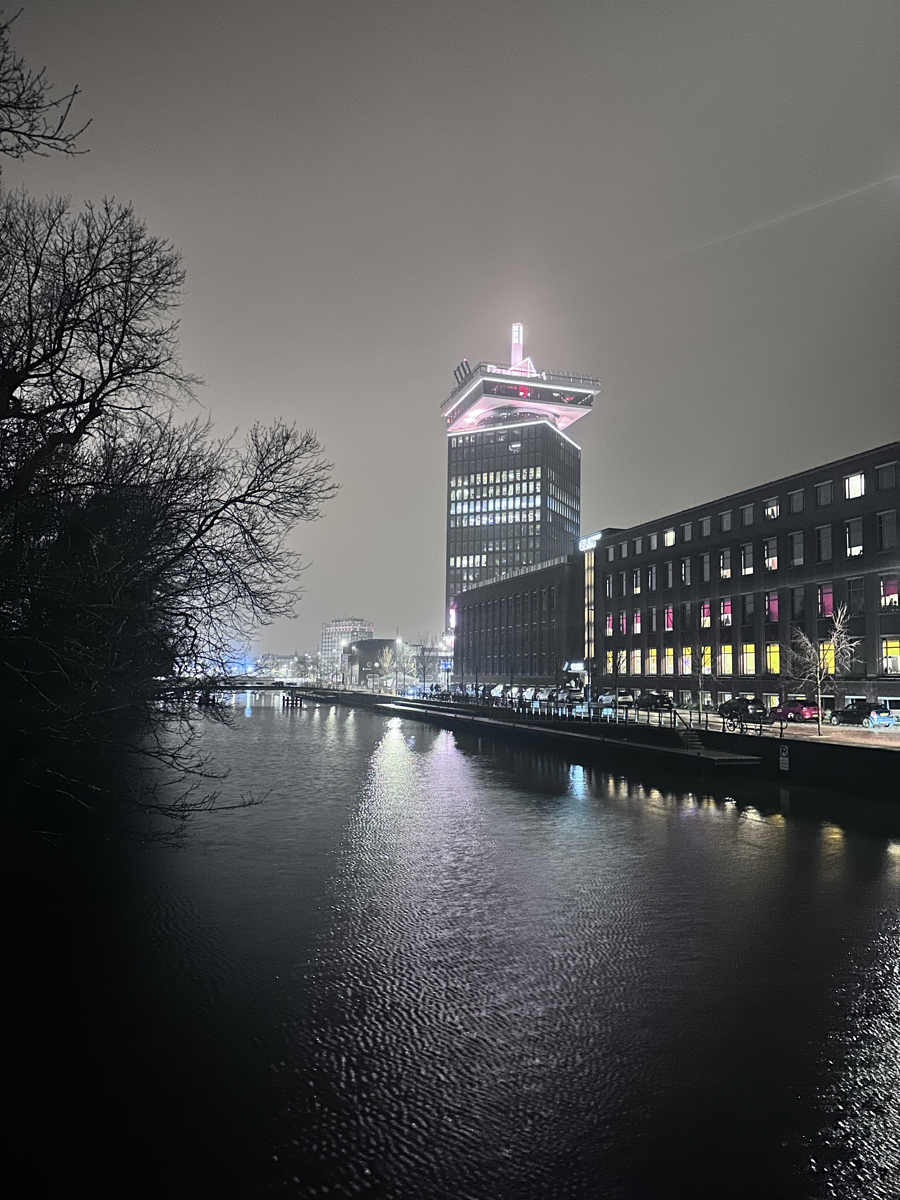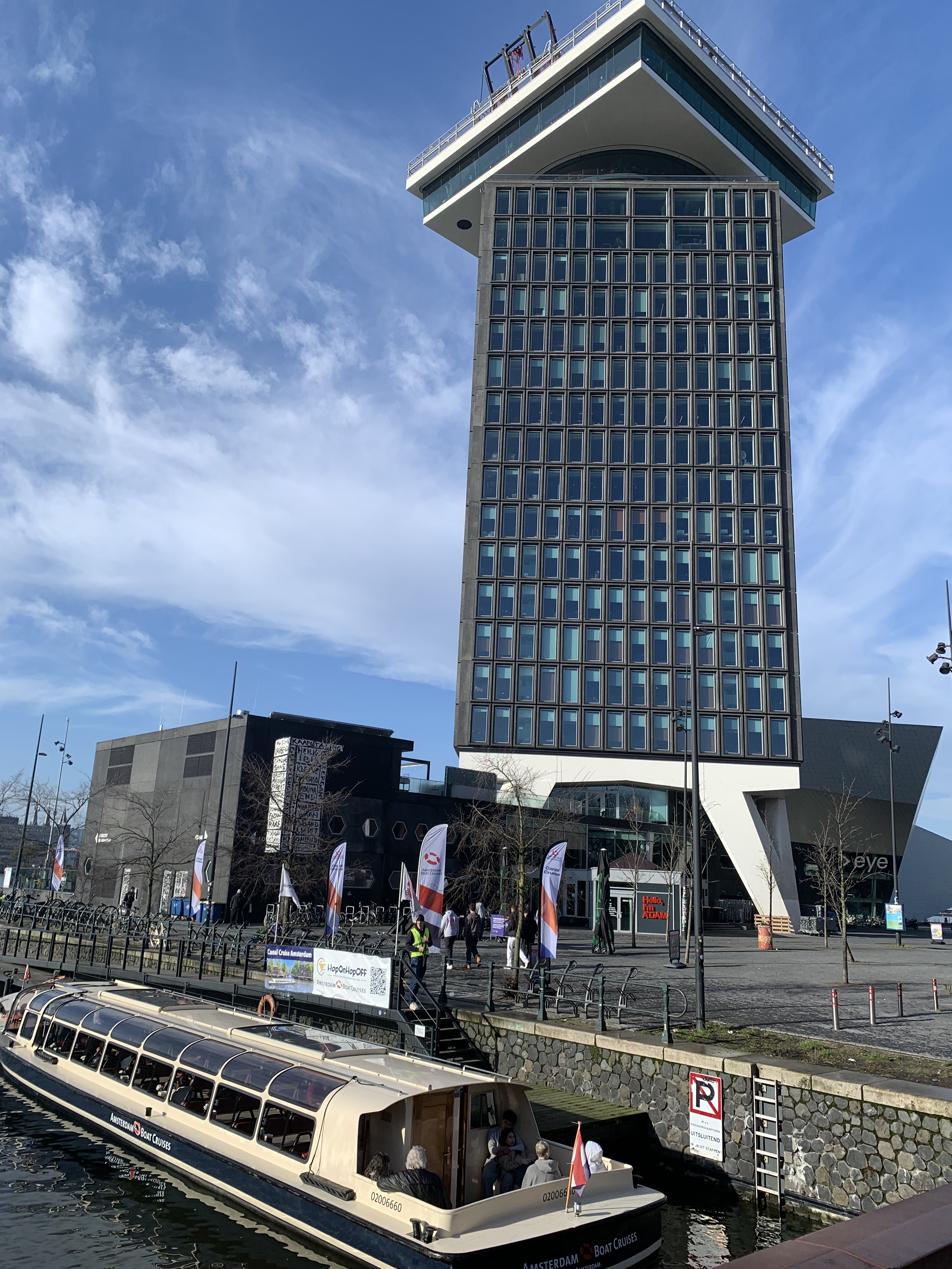 First, the building is a tower – 100 meters tall – so it’s a landmark on the banks of the IJ in what is a relatively low-slung city. It was designed in 1966 and originally called Toren Overhoeks (tower across the river). We have a love for concrete buildings, and this one is interesting because the tower is placed diagonally in relation to the substructure and the tower’s roof ornamentation.