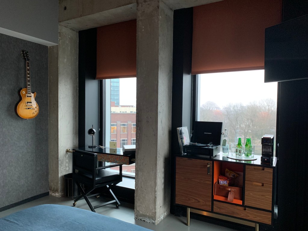 The room was fun with an aesthetic that I might call “rock n’ roll chic.” On the wall hung a guitar; and alongside the mini bar, which featured the ingredients and instructions for a kopstoot, was a turntable with a handful of albums.