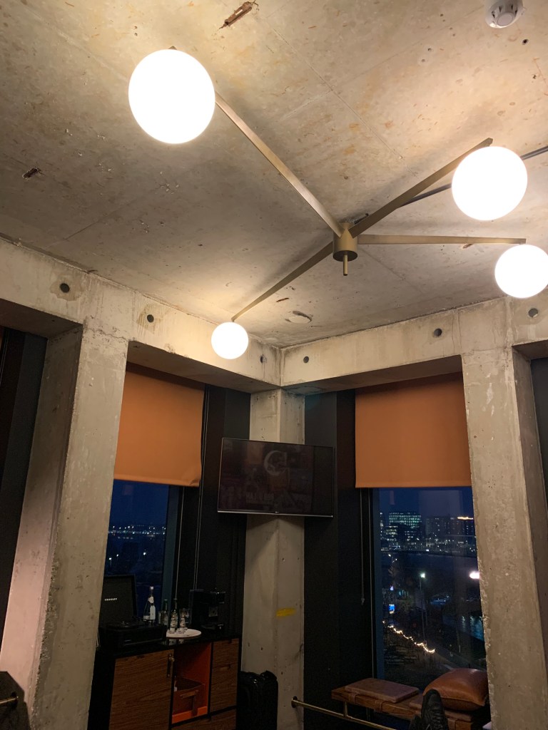 As you well remember, I spent a lot of time offering ideas for what I would do if I ran the hotel. Inside the rooms, it was clear that the housekeeping staff were paying attention to the things people notice: smoothing the bedding, making sure the shower is sparkling, dusting the furniture surfaces. But our room – I’m guessing all rooms – could use some attention to detail. Dust had built up inside the electrical outlets, and the soap and lotion dispensers at the bathroom sink needed a good wipe down near the pumps. The painted trim along the floor and the doors were black, and anything black shows every nick and dent; sending a maintenance team around to regularly engage in deep cleaning and paint touch-ups would take the guest experience to the next level.