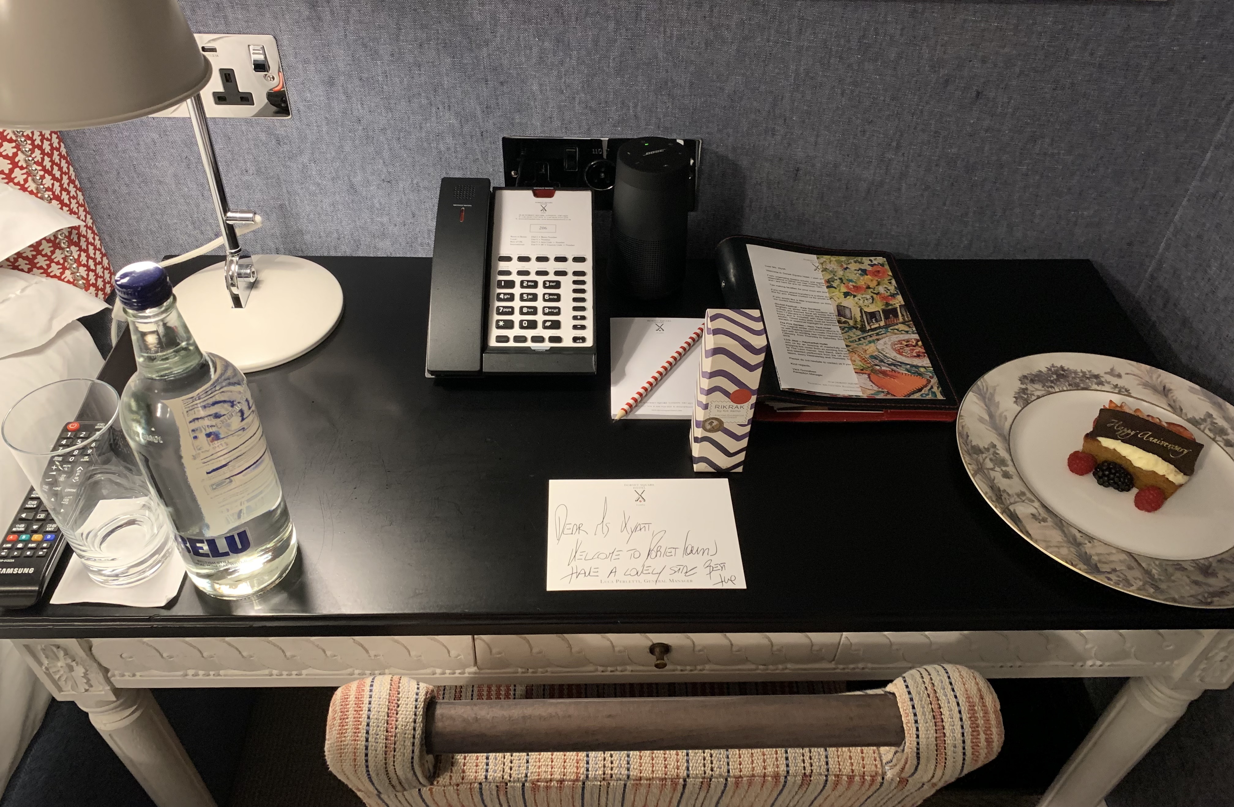 While it would have been tempting to sit down and relax as preparations for our room were completed, London called, so we left our bags and headed out. By the time we returned, it was evening, and the housekeeping staff was doing turndown services. We found bottled water at each bedside, a small bottle of RikRak pillow spray (which smelled amazing) and tube of hand cream, a welcome note and a piece of cake.