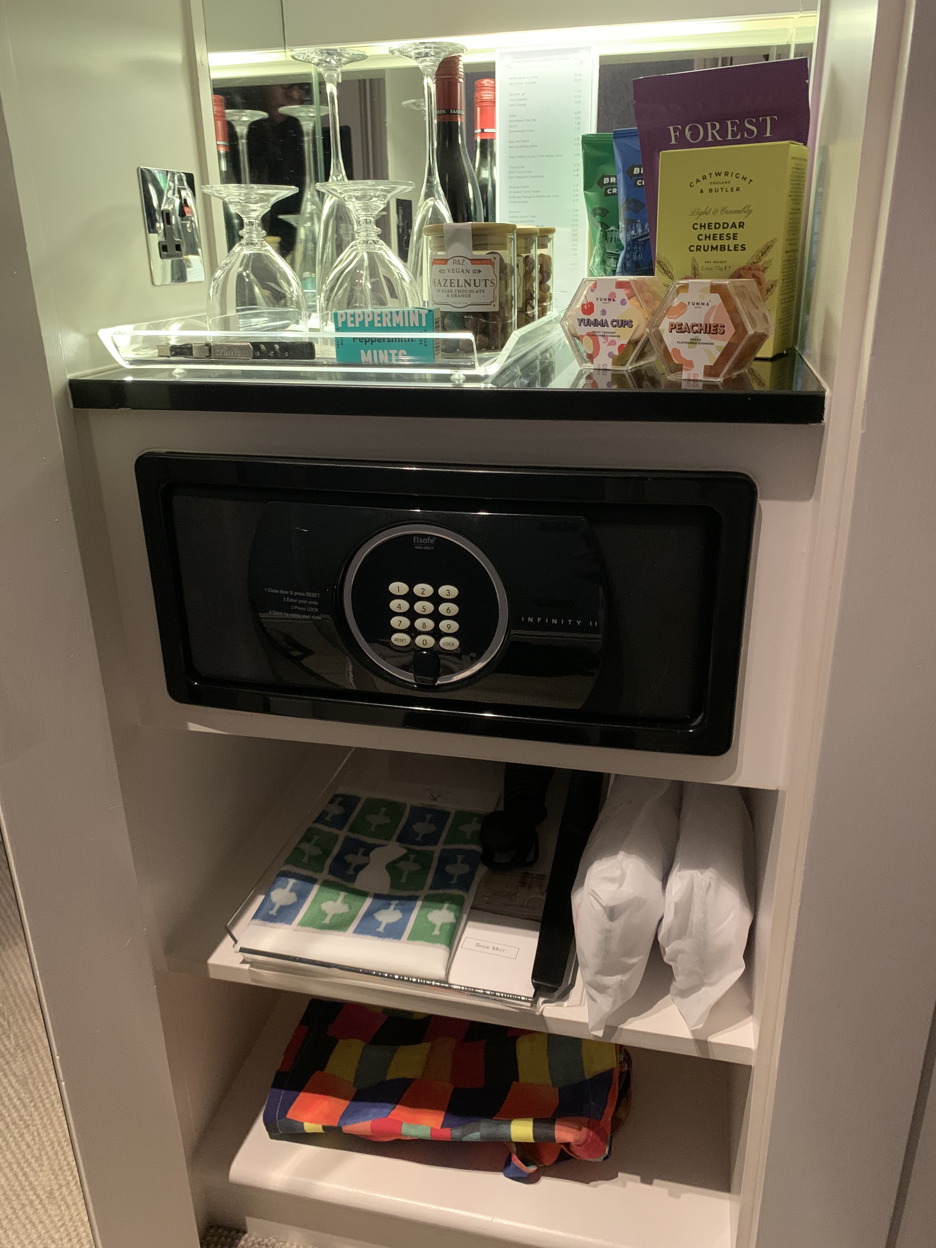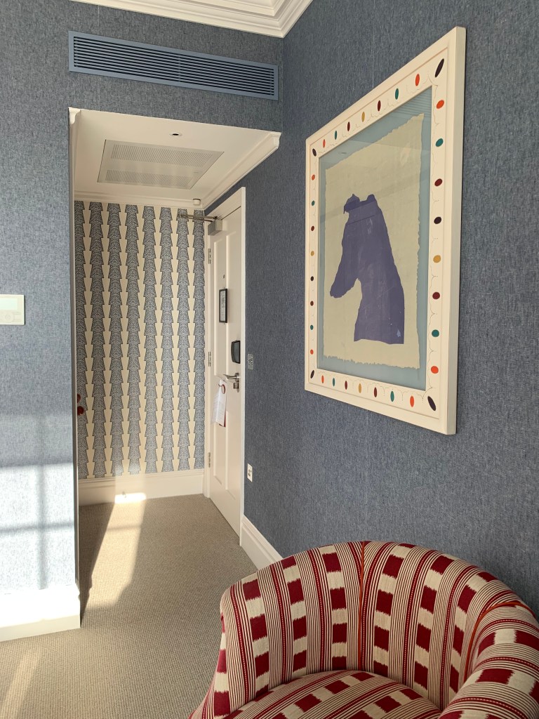 I particularly loved the large painting of a dog in silouette, but the room had lots of smaller details to enjoy as well, including the knobs on the closet door, the selection of drinks and snacks in the minibar, and the colorful canvas bag we were invited to take with us.