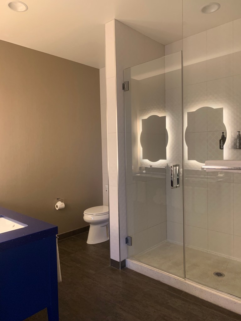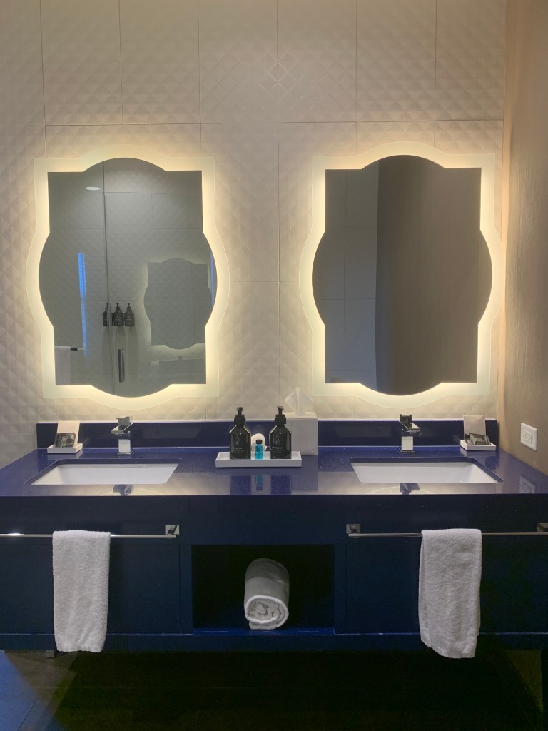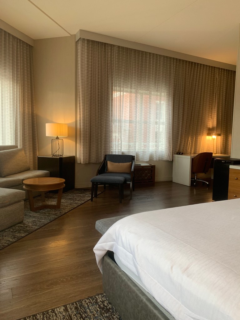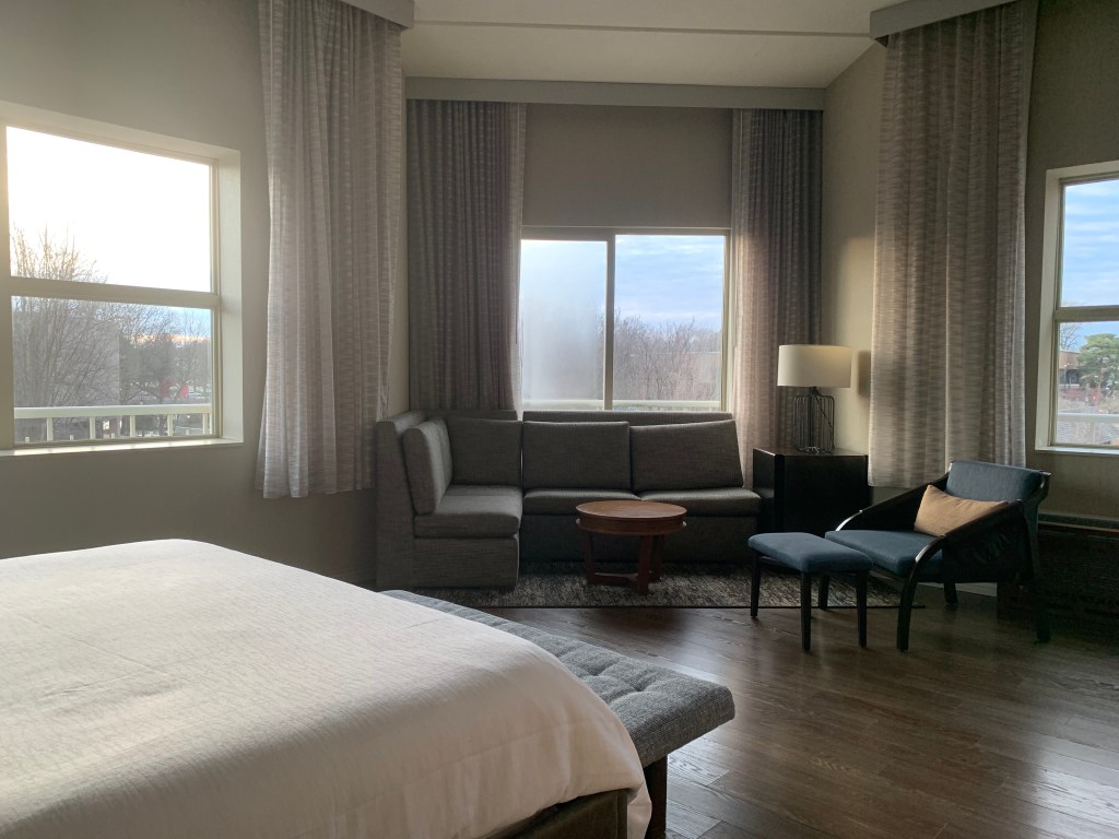 Beyond that, the room had everything we needed with plenty of storage; double sinks; a nice seating area with an L-shaped couch, chair and ottoman; and what felt like a massive bed. Robes would have been appreciated, and the in-room coffee wasn’t great, but those things didn’t get in the way of our enjoyment. If we happen to find ourselves in Naperville again, we’d return to the Indigo. And for anyone going there, our friend was right. It is the place to stay in this Chicago suburb.