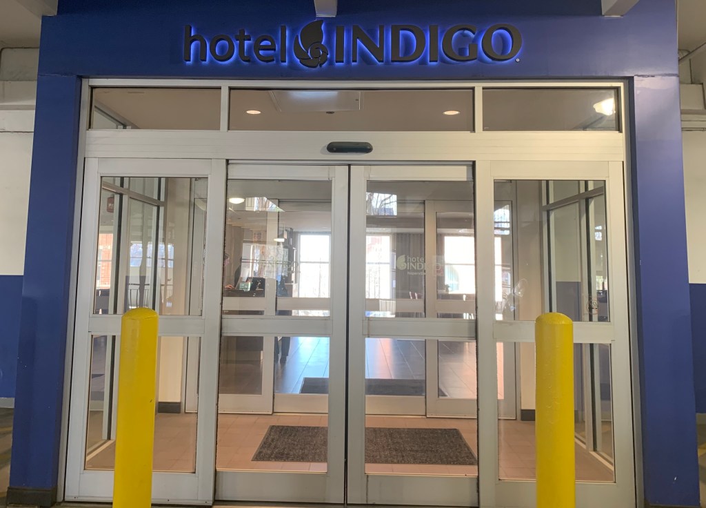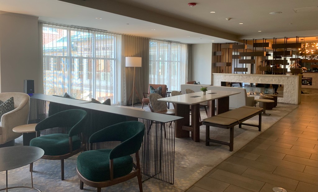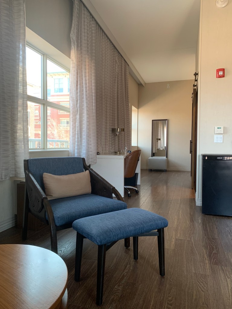 One slightly quirky thing (that didn’t matter much but we noticed) was the hotel’s entrance. The Indigo spreads over two buildings on either side of Water Street with a skyway that connects the two. The lobby is on the second floor, but to get to it, you either need to enter through the parking garage, which is actually the most distinct entrance, or through one of two non-distinct sets of doors on Water Street. The hotel’s first floor is retail and restaurants, so we understand not wanting to use valuable real estate for a grand hotel entrance, but the streetside entrances seemed a little underwhelming. If we hadn’t arrived via our car (I suppose most everyone does, and that probably says something about Naperville), it would have been a trick figuring out how exactly to get in.